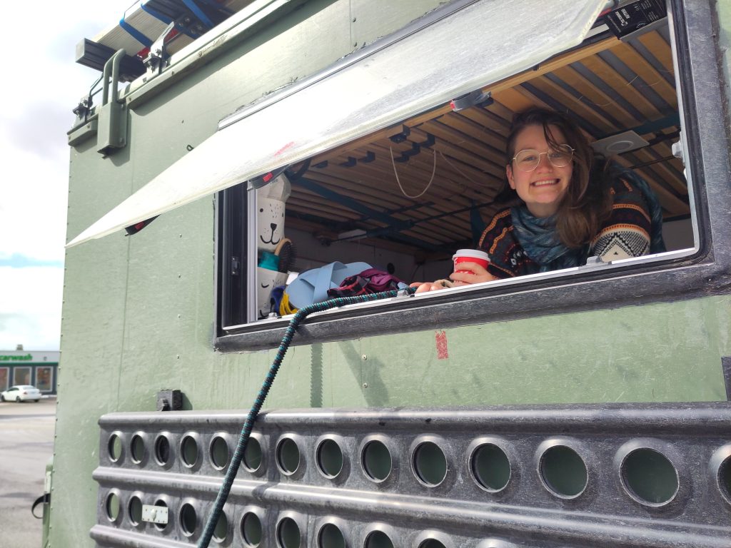 Unsere gekauften Errungenschaften wollten verarbeitet werden, deswegen wurde noch gekocht. Nach dem Gemüse schneiden, sahen wir eine Raupe in unserem Biomüll, also unserer Trockentrenntoilette, die fleißig die Paprikainnereien mampfte. Die kann eigentlich nur von/aus der Paprika selbst gekommen sein. Etwas merkwürdig, aber niedlich. Wir ließen unseren neuen Mitbewohner dort, wo er war, denn draußen würde er direkt erfrieren bei mittlerweile -6°C und weiter fallenden Temperaturen. Während wir darauf warteten, dass die Paprika angebraten war, nahm ich eine Bewegung am Fenster war. Eine junge Frau hüpfte vor dem Fenster auf und ab, um einen Blick rein zu erhaschen. Sie hatte scheinbar nicht bemerkt, dass wir da sind. Als wir ihr zuwinkten und sie das bemerkte, machte sie ein erschrockenes Gesicht und rannte ganz schnell weg. Für sie war die Situation sichtlich peinlich, für uns sehr unterhaltsam. Mit einem Schmunzeln auf den Lippen ließen wir den Tag ausklingen.