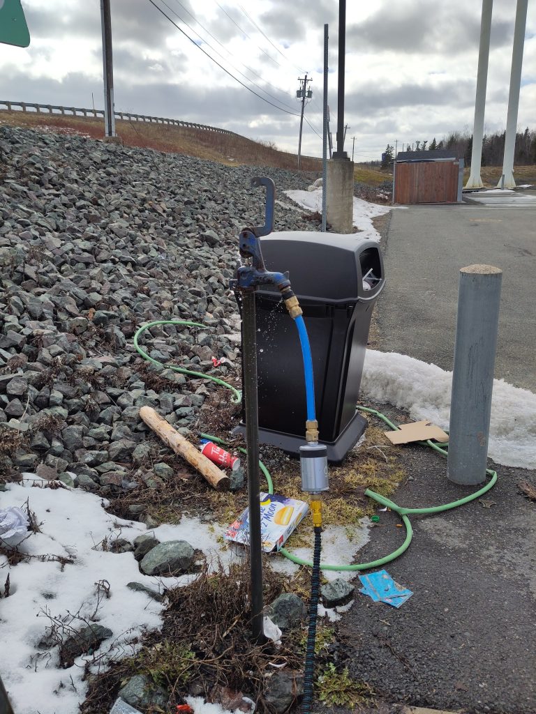 Nun mussten wir noch Wasser auffüllen. Der Tank ist zwar nicht leer, aber die Dichte an möglichen Quellen wird im Norden immer kleiner. Diesen Standort hatten wir aus den üblichen Apps und er sah absolut fragwürdig aus. Hinterm DriveThrough eines Tim Hortons (typisch kanadische Schnellrestaurantkette) mit einer defekten Entsorgungsstation für Wohnmobile. Der Wasserhahn funktionierte überraschenderweise und das Wasser schmeckte nicht nach Chlor. Eine echte Offenbarung nach ca. 80l Wasser mit Chlor-Geschmack. Wir Filtern das Wasser trotzdem, weil die Filter eben da sind und man weiß ja nie. Bretti holte sich noch eine heiße Schokolade und so ließ sich die Wartezeit dann ganz gut überbrückend. Nebenbei konnten wir wieder das Verhalten der Einheimischen beobachten. Dass man lieber lange am DriveThrough steht und wartet anstatt auszusteigen und für ca. 3 Minuten ins Geschäft zu gehen erschließt sich uns wirklich nicht.