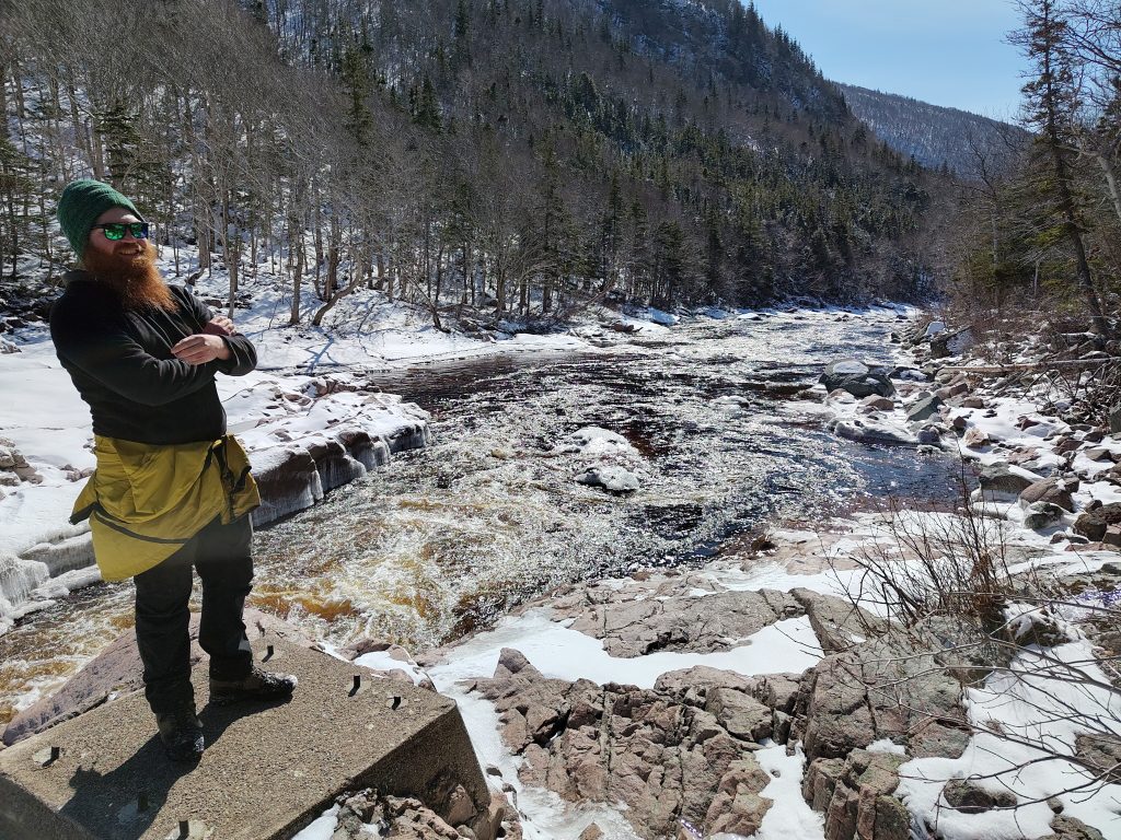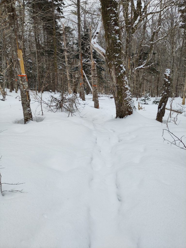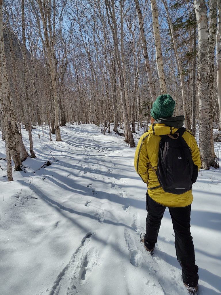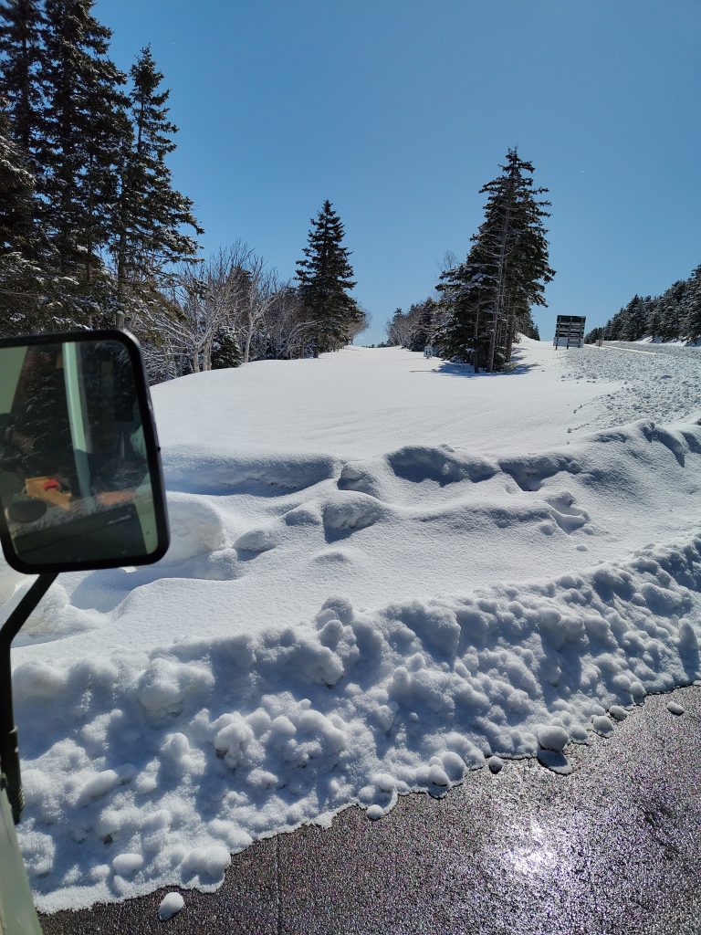 Heute ging es in den Nationalpark Nova Scotias, den Cape-Breton Highlands Nationalpark. Auch hier ist alles soweit geschlossen, aber wandern kann man trotzdem. Ich hatte auch einen Wanderweg des Parks rausgesucht, den Skyline Trail, habe mir aber schon gedacht, dass es nach unserer gestrigen Erfahrung an den Egypt Falls schwierig werden könnte. Um den Nationalpark herum führt auch noch die Panoramastraße Nova Scotias, der CabotTrail. Allein für die Autofahrt lohnt sich der Weg hierher schon. Als wir von der Hauptroute auf die Straße zum Wanderparkplatz abbiegen wollten, standen wir jedoch vor einer 1,5m hohen Wand aus Schnee. Das ist auch für den Volvo zu viel, zumindest alleine und ohne Schneeketten. Die Hauptroute des Cabot Trails ist sonst wirklich top geräumt, aber irgendwann ist wohl auch mal gut. Es gibt im Park unzählige Wanderwege und entsprechend suchten wir uns einen weiter unten raus und fuhren zum Parkplatz, den wir auf dem Hinweg schon gesehen hatten.