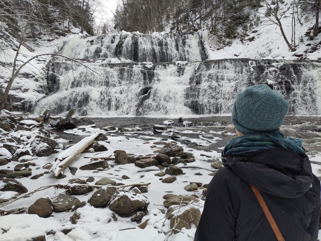 Um den kalten Tag(max. -5°c) trotzdem zu nutzen, hatte ich einen Wasserfall, die Egypt Falls, rausgesucht. Dieser ist nach einer kurzen Wanderung zu erreichen und sah recht beeindruckend aus. Generell habe ich bei dem Plan nicht bedacht, dass Wasserfälle dazu tendieren, im Gegensatz zum Meer, “oben” zu sein. Das heißt. dass wir erstmal weit in die Berge fahren mussten und hier sehr viel Schnee lag. Der Weg bis zum Wanderparkplatz war überraschenderweise geräumt und so fuhren wir gemütlich im 1st Gang die vereiste Straße hoch. Die Wanderung war ca. 1km lang und ging etwa 100 Höhenmeter wieder runter. Teilweise ist man bis zum Knie im Schnee versunken, deswegen waren wir überrascht andere Menschen zu treffen, die den weg in Freizeitkleidung absolviert haben. Der Aufwand lohnt sich auf jeden Fall. Der Weg durch den verschneiten Wald ist schon alleine den Aufwand wert. Der Wasserfall dazu ist auf jeden Fall einer meiner Wasserfall Highlights bis jetzt. Wir verbrachten eine Weile am Fuß des Wasserfalls und genossen die Naturgewalten. Da es aber immer noch sehr kalt war ging es bald zurück. Untrainiert wie wir immer noch sind, kamen wir schnaufend am Parkplatz wieder an. Das sind ganz sicher mehr als 100 Höhenmeter. Zwei andere Wanderies hatten sich in der Zwischenzeit zielstrebig mit ihrem Pickup neben der geräumten Straße festgefahren, das konnten wir aber mit gemeinsamem Anschieben schnell erledigen.