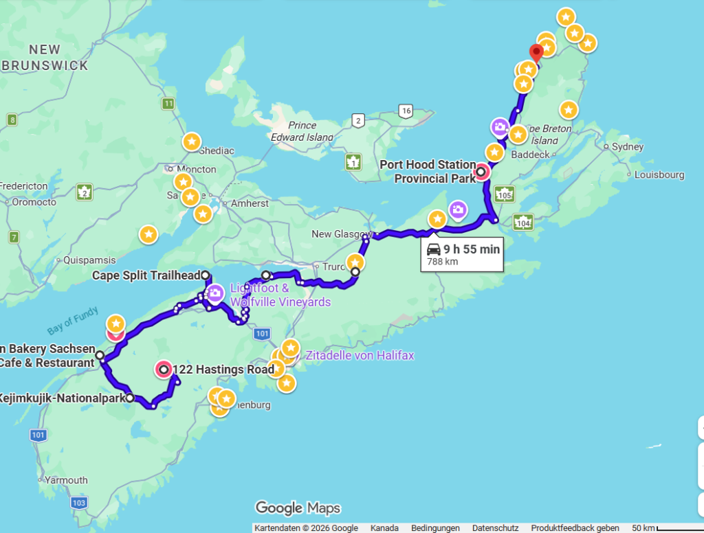 Nach dem erfolgreichen Tankstop ging es immer weiter die Küste entlang auf die Nordinsel Nova Scotias. Hier fanden wir auch einen schönen Stellplatz mit Meerblick und liefen noch runter ans Wasser. Der Wind war eisigkalt aber die Sonne war da also wurde Vitamin D getankt.