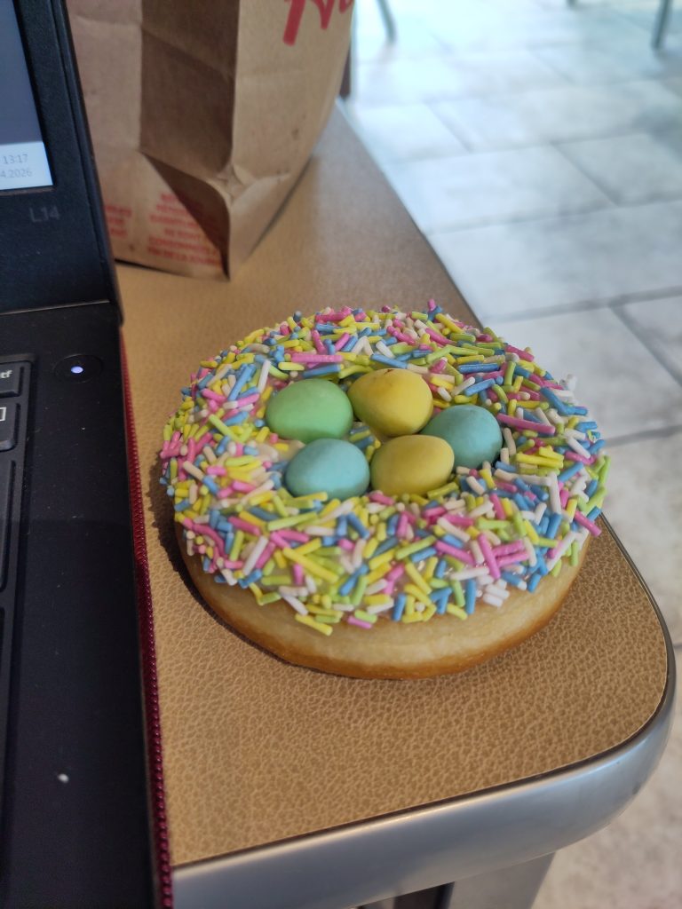 Bei Tim Hortons angekommen holen wir uns was zu trinken, nutzen den Komfort einer beheizten Spültoilette und sichern Fotos im offenen WLAN. Der Versuch, unseren Router im Auto mit dem offenen WLAN zu verbinden scheitert leider und auch der Empfang ist dort deutlich schlechter, so dass wir uns entscheiden, uns doch mit unseren Laptops ins Café zu setzen, um die restlichen Updates herunter zu laden. Dazu gibt’s noch ein bisschen Osterfettgebäck.
